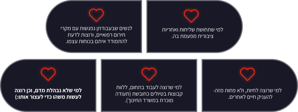 לנשים שבעבודתן נפגשות עם מקרי חירום רפואיים, ורוצות לדעת להתמודד איתם בכוחות עצמו.